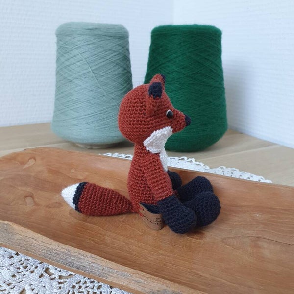 Dit lieve vosje is gemaakt naar het patroon van MyKrissieDolls. Zittend is het vosje ongeveer 12cm hoog.